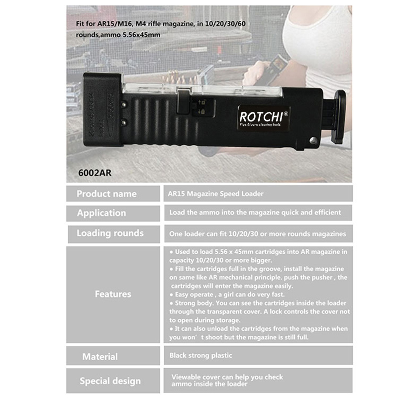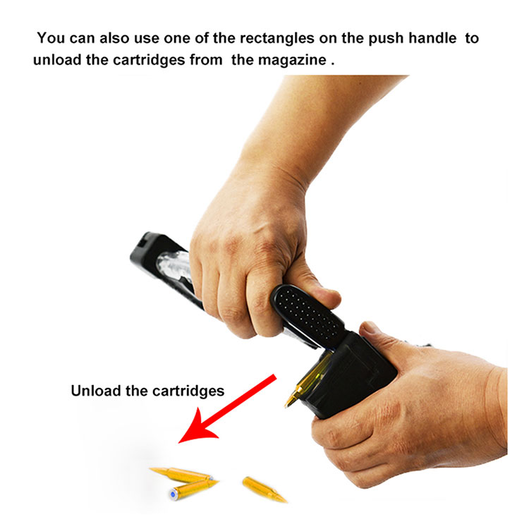 Bộ nạp tốc độ của tạp chí súng cho hộp mực 5,56x45mm được làm bằng thân nhựa gia cố, được sử dụng rộng rãi để nạp hộp mực vào tạp chí AR có dung lượng 10-30