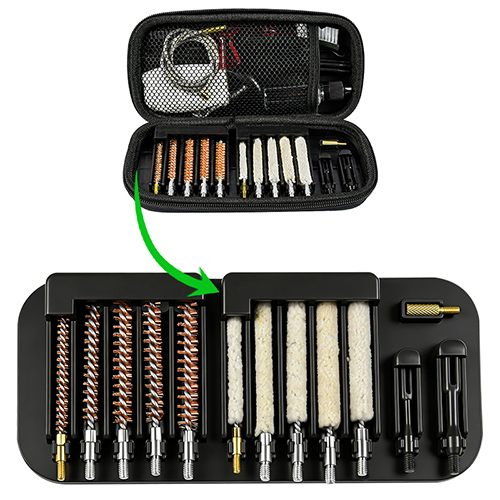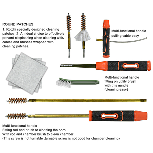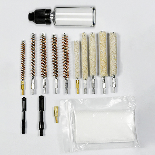 Bộ vệ sinh súng trường bao gồm 5 kích cỡ (.177, .22, .243, .27, .30 cal.), bàn chải bằng đồng và giẻ lau bông, 5 que, 2 calbes. Cát và màu đen cho sự lựa chọn.